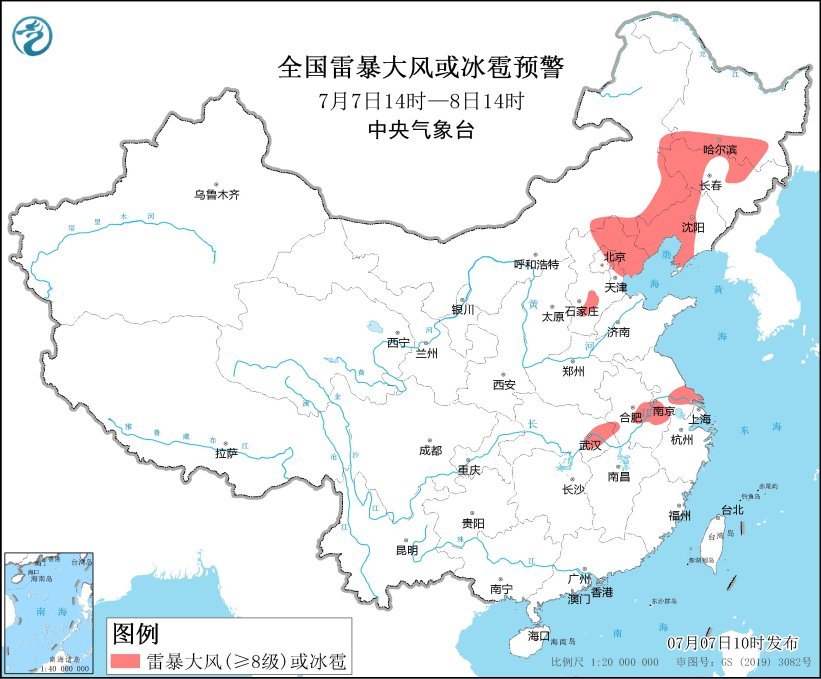 预计7月7日14时至8日14时,内蒙古东南部、黑龙江南部、吉林中西部、辽宁中西部、河北北部和中部、北京东北部、天津北部、安徽中部、江苏东南部、湖北东部等地的部分地区将有8-10级雷暴大风或冰雹天气。