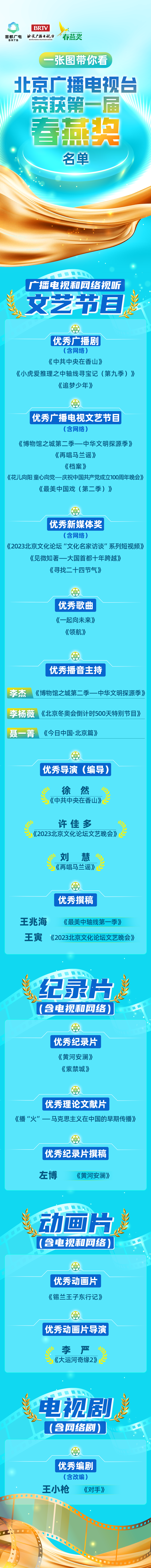 第一届北京市广播影视春燕奖评选表彰发布会于10月27日下午在北京举行。当天,正式揭晓了本届获奖名单,包括电视剧(含网络剧)、电影、纪录片、动画片,广播电视和网络视听文艺节目、网络电影、公益广告、科技奖8大类共65 部作品综合奖和53名个人单项奖。北京广播电视台荣膺28项荣誉。