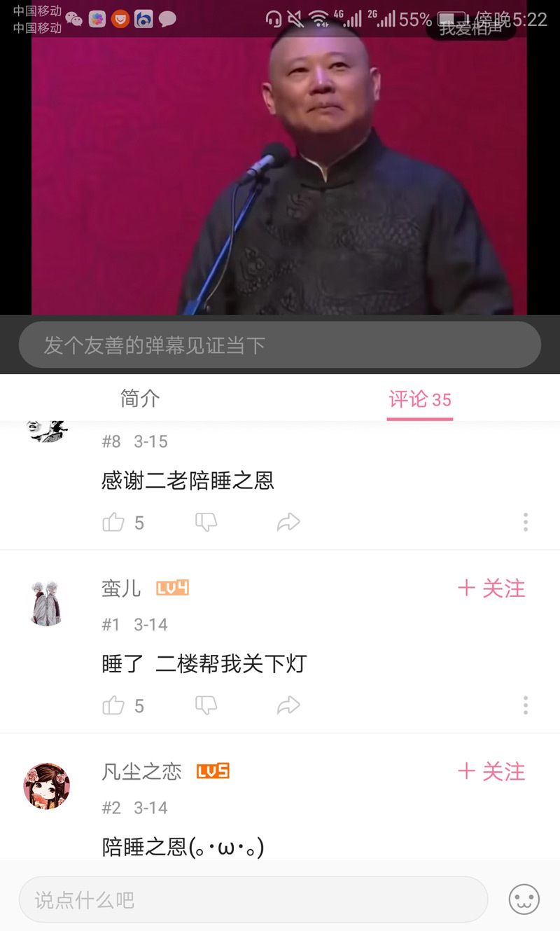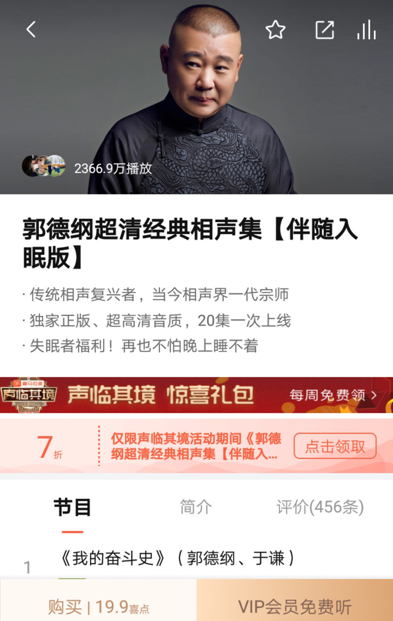 最近,郭德纲成了"陪睡专业户"。在一家视频网站上,记者发现,网友们对郭德纲的相声视频评价非常多,不过,前10条留言中就有7条是在感谢郭德纲、于谦的"陪睡之恩",甚至有的视频标题就打出了"睡前必听"的字样,并获赞96万。在某听书软件里,还有"郭德纲相声集伴随入眠版"音频,需付费收听。