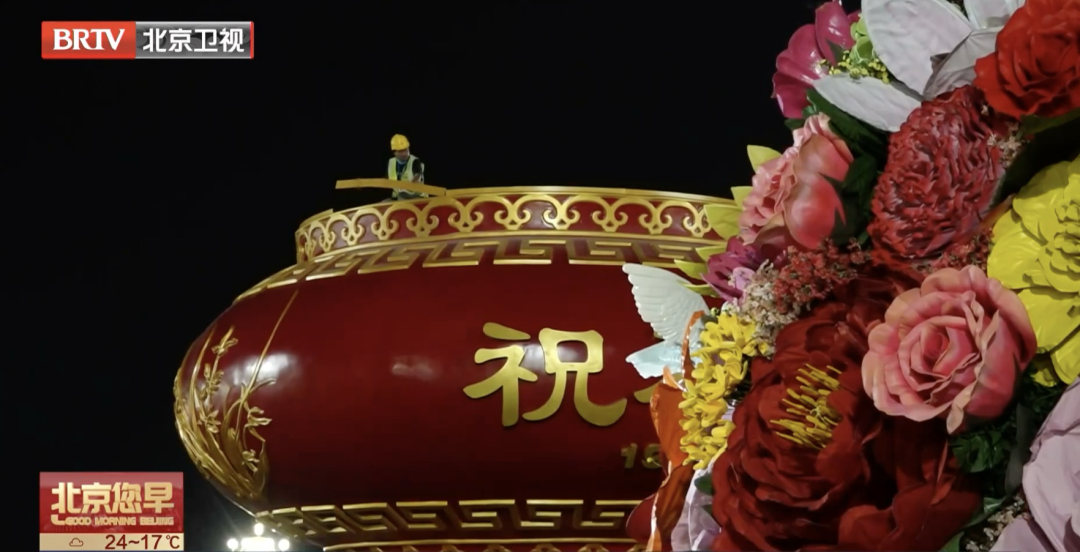 随着国庆节的脚步临近,万众瞩目的天安门广场国庆76周年“祝福祖国”巨型花篮今天凌晨完成了主体结构合龙。3天后,中心花坛将完美亮相!