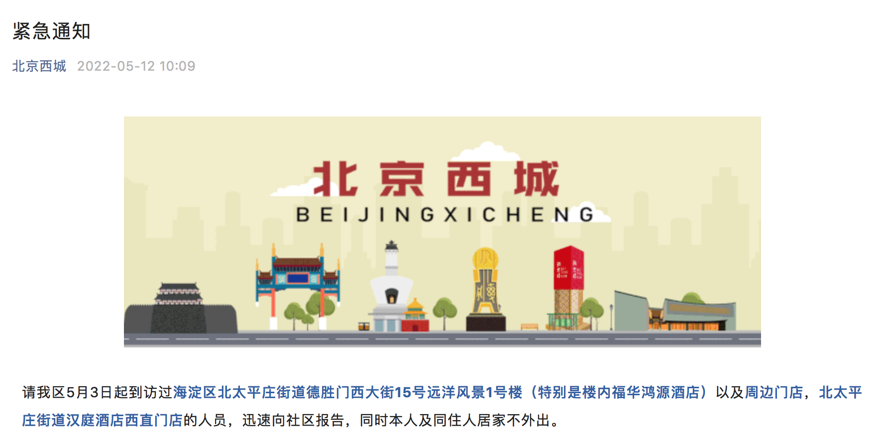 @北京西城 刚刚发布消息:请我区5月3日起到访过海淀区北太平庄街道德胜门西大街15号远洋风景1号楼(特别是楼内福华鸿源酒店)以及周边门店,北太平庄街道汉庭酒店西直门店的人员,迅速向社区报告,同时本人及同住人居家不外出。