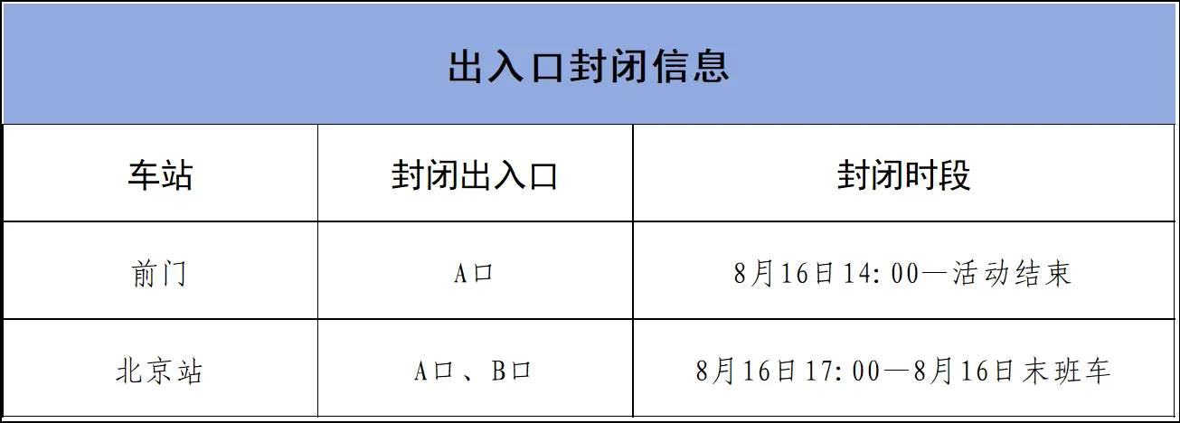 记者从北京地铁了解到,根据北京市公安局公安交通管理局《关于对部分道路采取临时交通管理措施的通告》,为保障专项活动安全顺利,2025年8月16日14时起至活动结束,地铁1号线八通线、2号线、4号线、5号线、6号线、8号线、10号线、14号线、19号线、昌平线部分车站采取出入口封闭、车站封闭措施,相关换乘站停止换乘,请乘客合理安排出行路线。