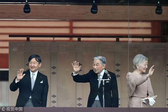 日本明仁天皇在皇后美智子、皇太子德仁陪同下,向民众挥手致意(视觉中国)
