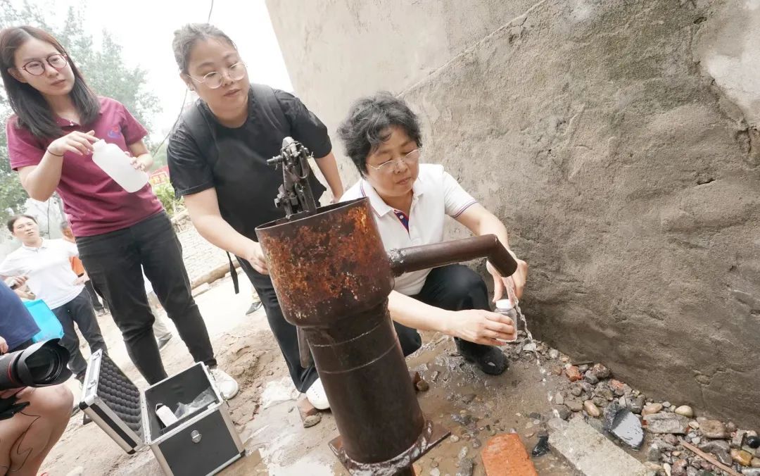 疾控人员首先向村委会工作人员详细了解村里的情况。“采集水样前,先要了解当地水井的分布情况和损毁情况,进行基线摸底后,再进行采样。”佟颖说。随后,疾控人员来到一个农户家。这家人使用的是一个传统的手压式压水机,根据实验室检测需要,疾控人员分别用含有不同保存剂的容器瓶采集水样,无菌瓶的水样用于检测病原微生物,另一瓶水样用于检测感官性状和一般化学指标。每天,疾控人员要到多个村落巡回采集水样。