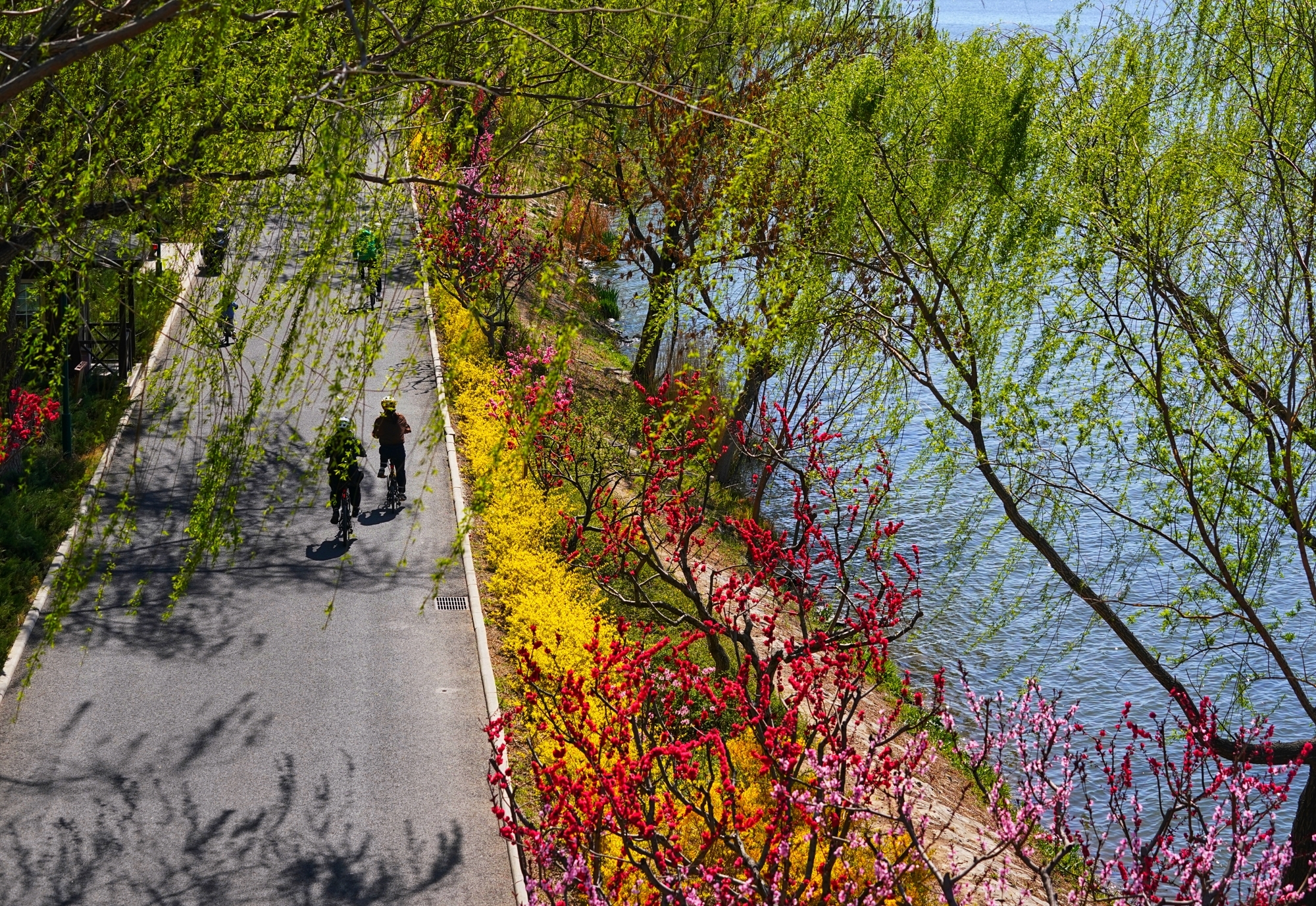 新柳垂丝拂碧水,繁花织锦缀长堤,粉桃、黄蕊、红枝相映成趣。