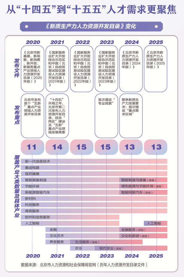 2024年目录升级为《新质生产力人力资源开发目录》,并在2025年继续更新。从设定人才需求评级,到增设重点需求专业及重点需求区域,目录体系逐步完善,已成为北京人才供求市场的重要“晴雨表”。