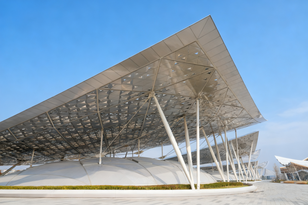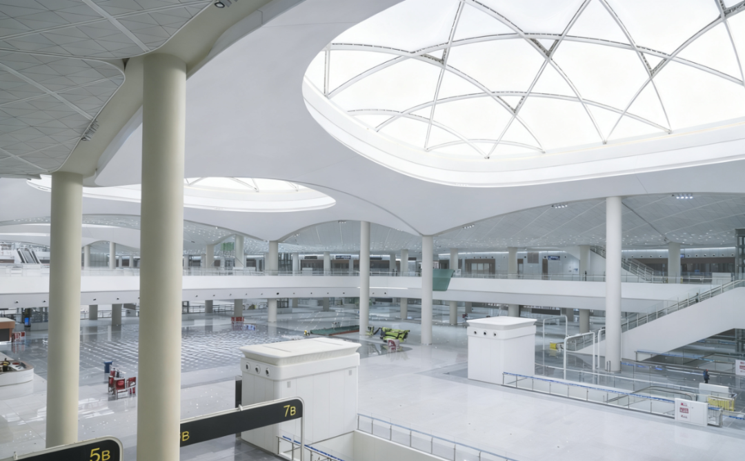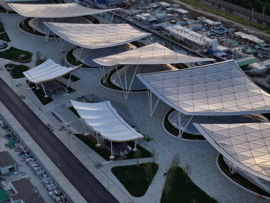 巨大的“京帆”屋盖绵延数百米,ETFE膜材在阳光下泛着温润的金属光泽,与周边建筑群形成错落有致的城市天际线。