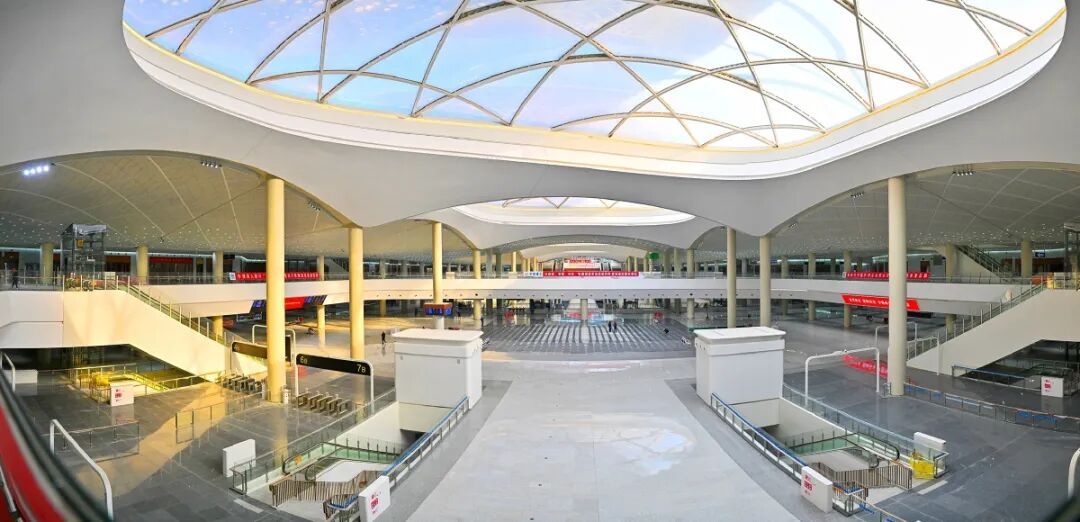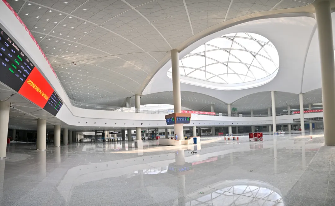 顶部的膜结构屋顶与水立方同款,但经过角度优化,透光率高达84%,傍晚时分,夕阳透过膜材洒进场站,在地面投下光影,无需开灯也亮如白昼。