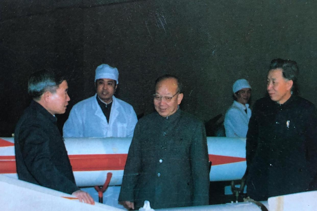 80年代火箭专家梁守磐(中)在总装厂房