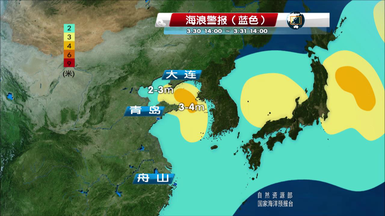 (北京时间记者 潘琦 报道)3月30日,国家海洋预报台发布消息称,根据中国海洋观测网实时水文气象资料分析,03月30日13时,受冷空气的影响,渤海、黄海北部出现了2到2.5米的中浪到大浪区。位于黄海北部的浮标在13时观测到有效波高2.4米的中浪;山东烟台龙口海洋站13时观测到有效波高1.8米的中浪。随着冷空气的持续影响,黄海的大浪区还将维持。国家海洋预报台根据《风暴潮、海浪、海冰和海啸灾害应急预案》发布海浪蓝色警报。受冷空气的共同影响,预计今天夜间到明天早晨,黄海将出现2.5到4米的大浪到巨浪区;山东半岛北部近岸海域将出现2到3米的中浪到大浪。海浪预警级别为蓝色。国家海洋预报台提醒,请在上述海域作业的船只注意安全,沿海各有关单位提前采取防浪避浪措施。