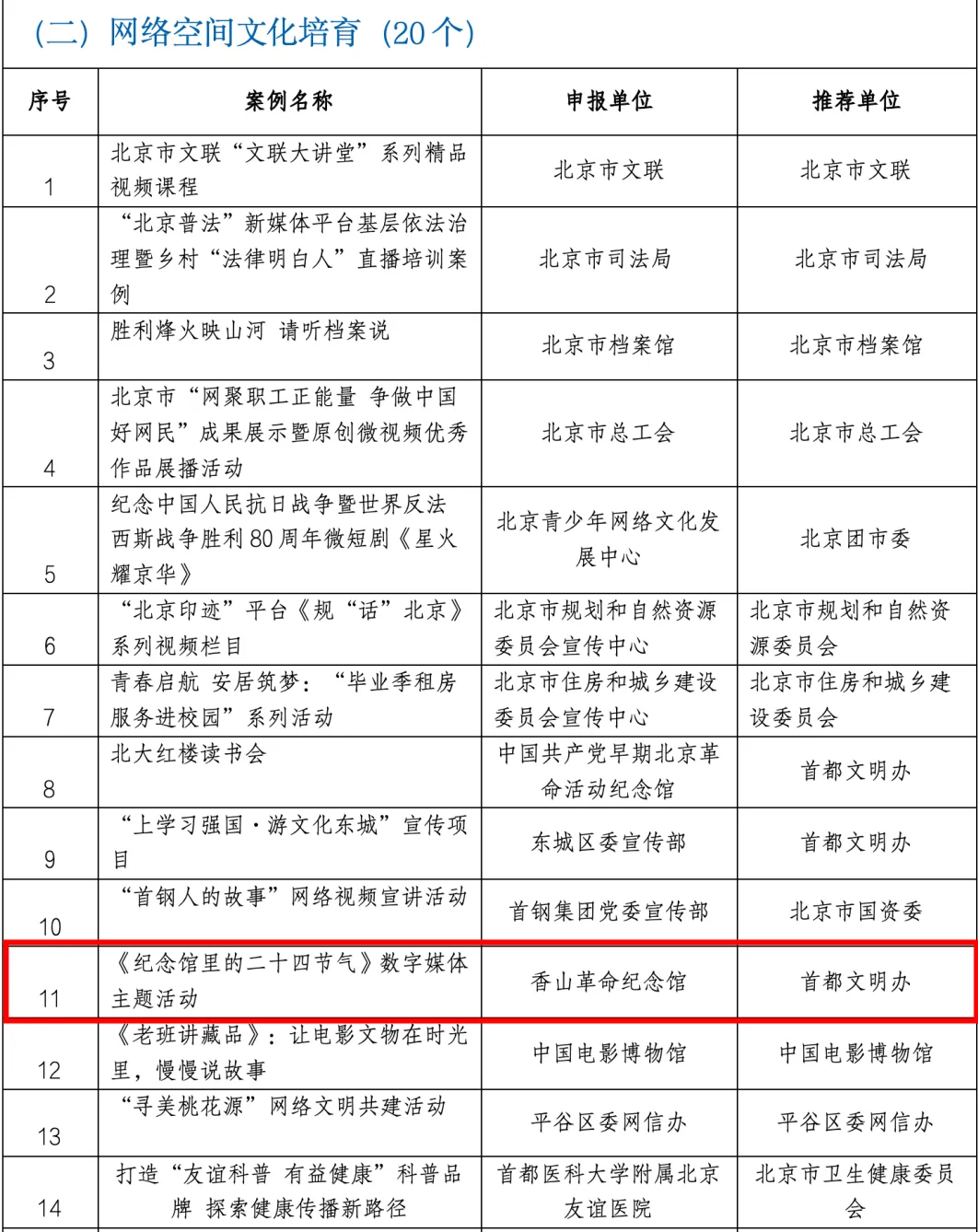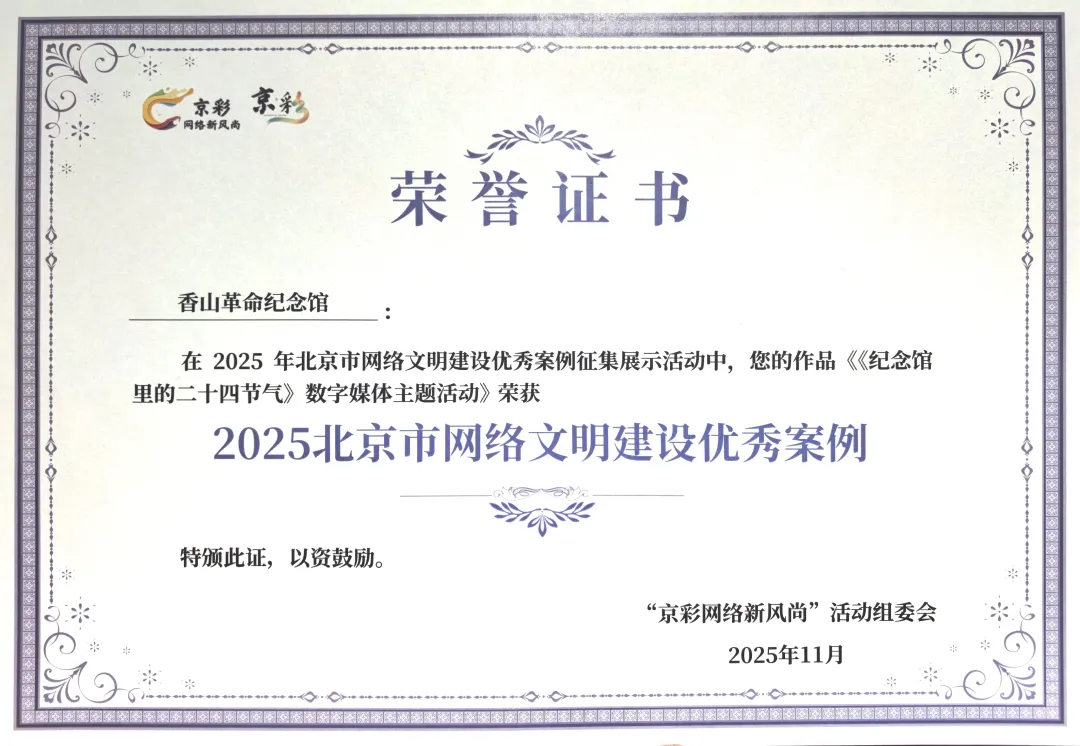 ▲香山革命纪念馆送选的作品《〈纪念馆里的二十四节气〉数字媒体主题活动》荣获2025北京市网络文明建设优秀案例。
