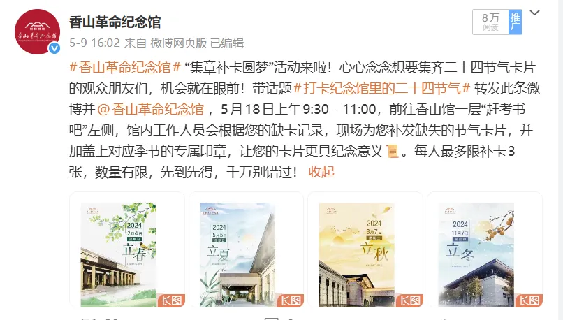 ▲香山革命纪念馆微博发布的“集章补卡圆梦”活动。