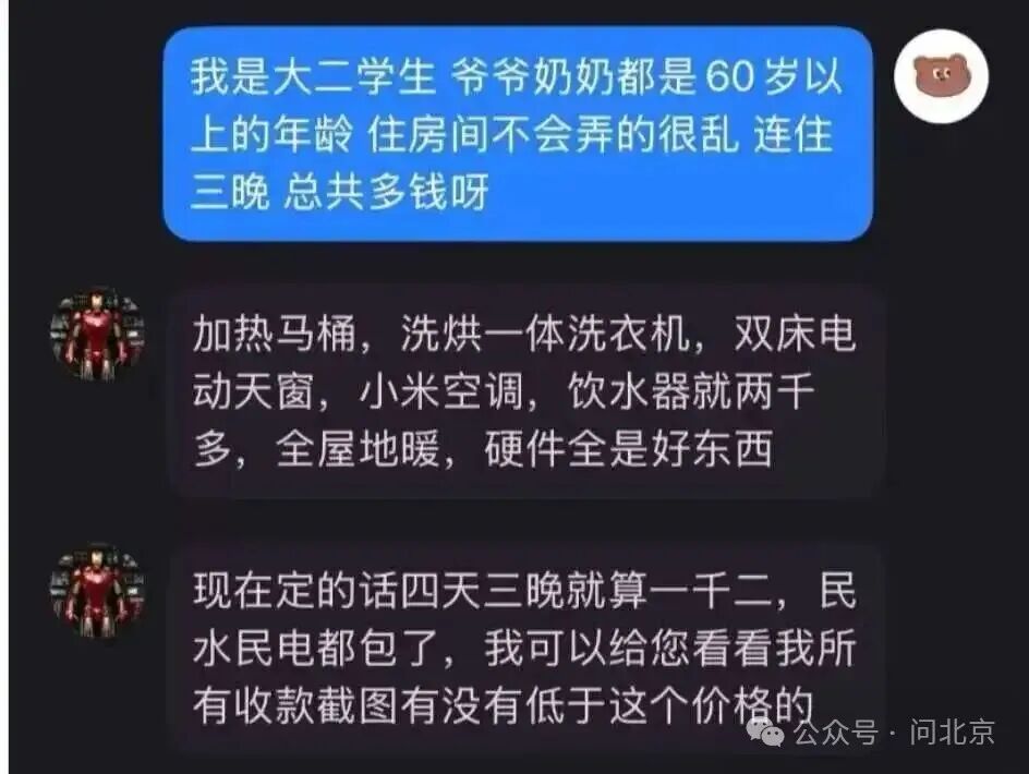 小苗:我是大学生,我是自己兼职赚的钱,想带爷爷奶奶去北京,他们两个从来也没出去过。当时,我们暑假去北京订房,普通一点的酒店都是五六百一晚上,就特别贵,便宜点两三百,都是郊外,来回打车什么的也都不方便,老人身体都不舒服,我就想着好不容易出去一次,就想又实惠,老人住得舒服,我就在小红书上找,有没有民宿,偶然间看到了一个人的小红书,他的意思就是他在北京有六七套民宿,可以随便选,他给我发房间,我就去选了一套。他跟我说的是500块钱一晚上,我们住三晚就是1500,然后他说我是学生的话可以给我优惠一点,最后是1200块钱的房钱,我们住三晚上,第二天我就把钱转给他了。