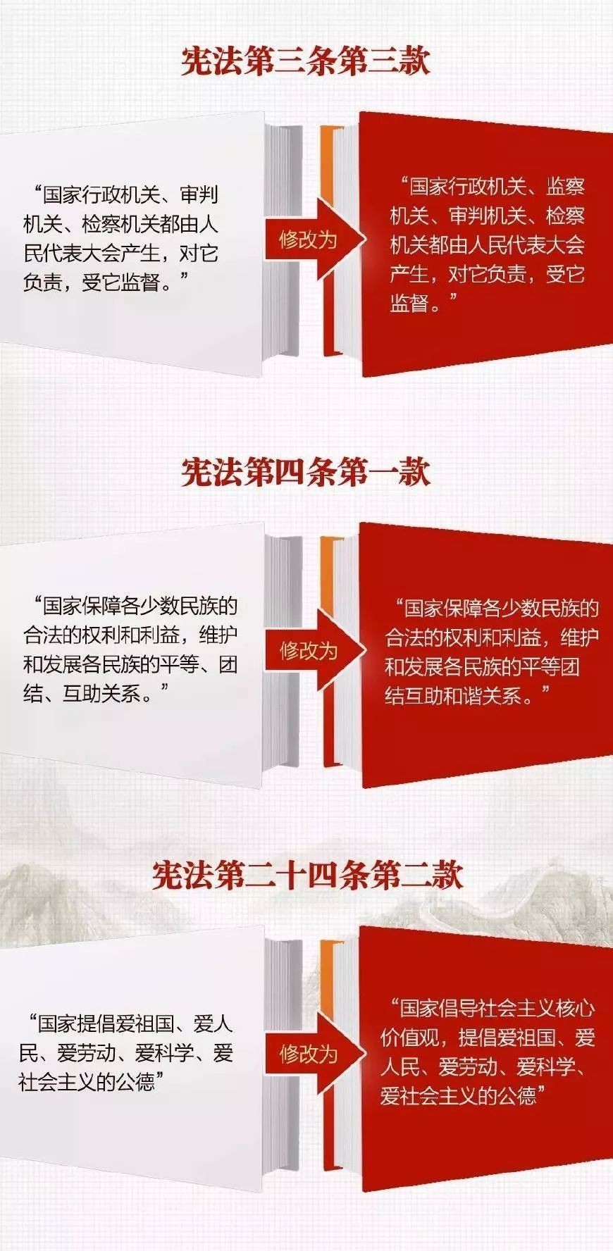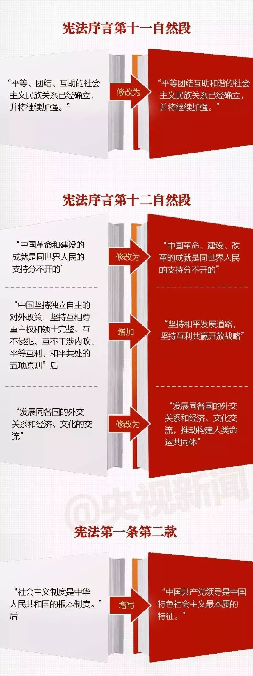 十三届全国人大一次会议2018年3月11日下午在人民大会堂举行第三次全体会议,经投票表决,通过《中华人民共和国宪法修正案》。本次宪法修改包含哪些重要内容?通过一张图,一起了解。