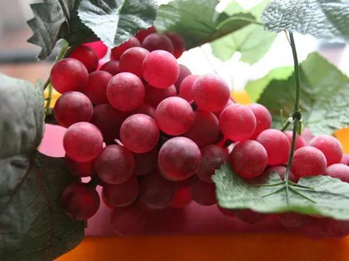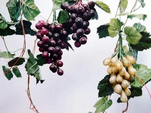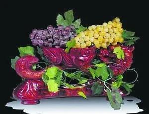 该工艺针对当时用泥陶制作葡萄球不透明、肉质感差的缺陷,选用玻璃进行制作,把玻璃料烧化,然后用 吹管吹成一颗颗葡萄珠,退火后再把它们连结成串,最后配上枝叶,喷上白霜制作而成。