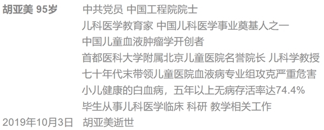 1982年,已58岁的胡亚美在《中华儿科杂志》发表了国内首篇儿童白血病疗效的报道《110例小儿急性淋巴细胞白血病治疗结果》;10年后,儿童急性淋巴细胞白血病5年存活率已升至74%;如今,在胡亚美创立的北京儿童医院白血病诊治团队内,白血病患儿的治愈率达80%以上,与国际水平接轨。40年的努力,换来超过3000名白血病患儿的治愈重返。于家于国,儿童白血病,终于被彻底划出了“不治之症”的行列。为此,一个叫胡亚美的老人,给了,她能给的一切。