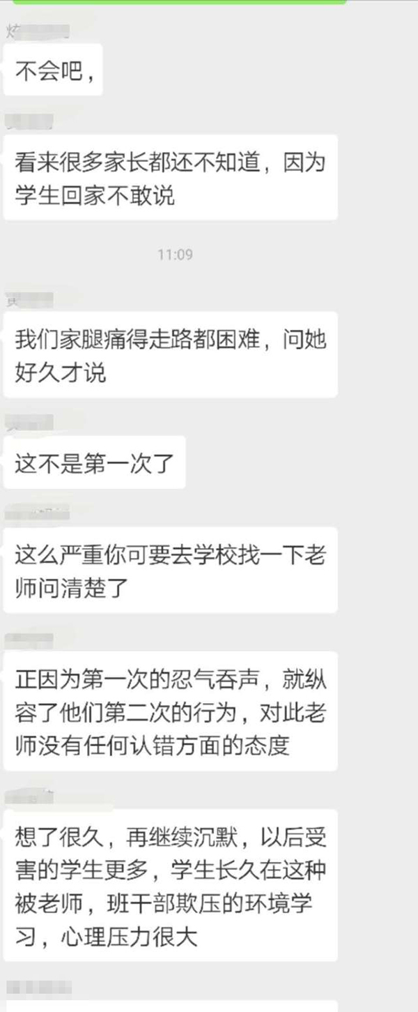 王先生把女儿的情况反映到家长群里,结果群里的家长纷纷表示,自己的孩子也反映当天遭遇到班长的殴打,有的孩子甚至“腿疼得难以走路”。