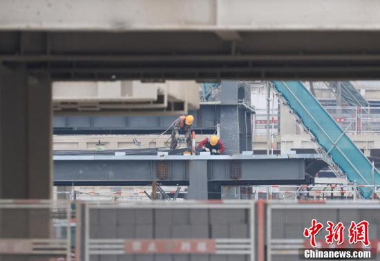 工人在项目现场施工,目前该项目中的王府井奥莱、诺岚酒店已经主体完工,汀云小镇钢结构完工88%。