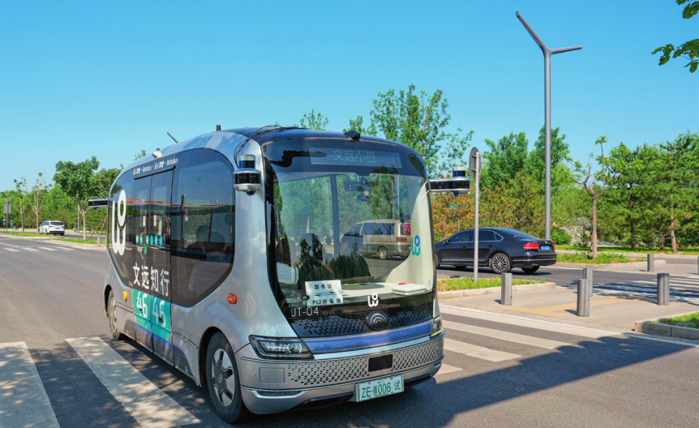 在北京城市副中心,一辆无人驾驶小巴在接送乘客(2024 年 5 月 21 日摄) 鞠焕宗摄 / 本刊