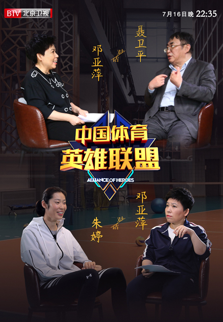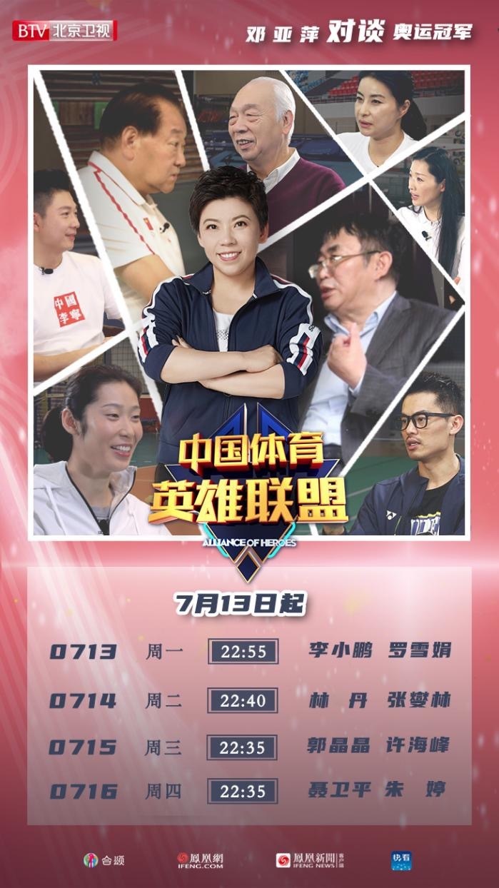 初代大魔王邓亚萍,对谈体育界各项目领军人物。跨界打造体育界高端人物访谈节目《中国体育英雄联盟》,7月13日起,将在北京卫视周一至周四每晚两集连播。节目中,亚萍将以老朋友的身份,来到他们生活和工作的场景,实地与嘉宾进行深度交谈,探知、分享他们在荣耀与坎坷中的奋斗故事和人生感悟。