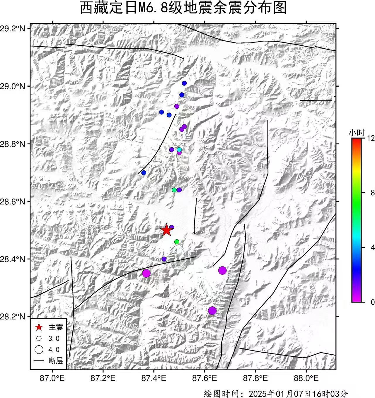 截至17时,共记录到3.0级及以上余震19次,其中4.0~4.9级地震3次,3.0~3.9级地震16次。最大余震为9时24分西藏日喀则市定日县4.4级地震,距主震震中约18公里。