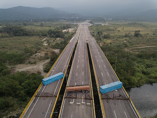 据英国广播公司(BBC)消息,本周四(2月7日),数辆装载着食物和药品的卡车,在哥伦比亚警方的护卫下抵达哥伦比亚边境城市库库塔。目前还不清楚这些人道主义援助将如何通过哥、委两国的边境。此前,委内瑞拉军队已用卡车集装箱和一辆油罐车封锁了提恩迪塔斯大桥,这座桥连接着哥伦比亚的库库塔和委内瑞拉的乌雷尼亚。那些装载着救援物资的卡车现在停泊在提恩迪塔斯大桥附近。
