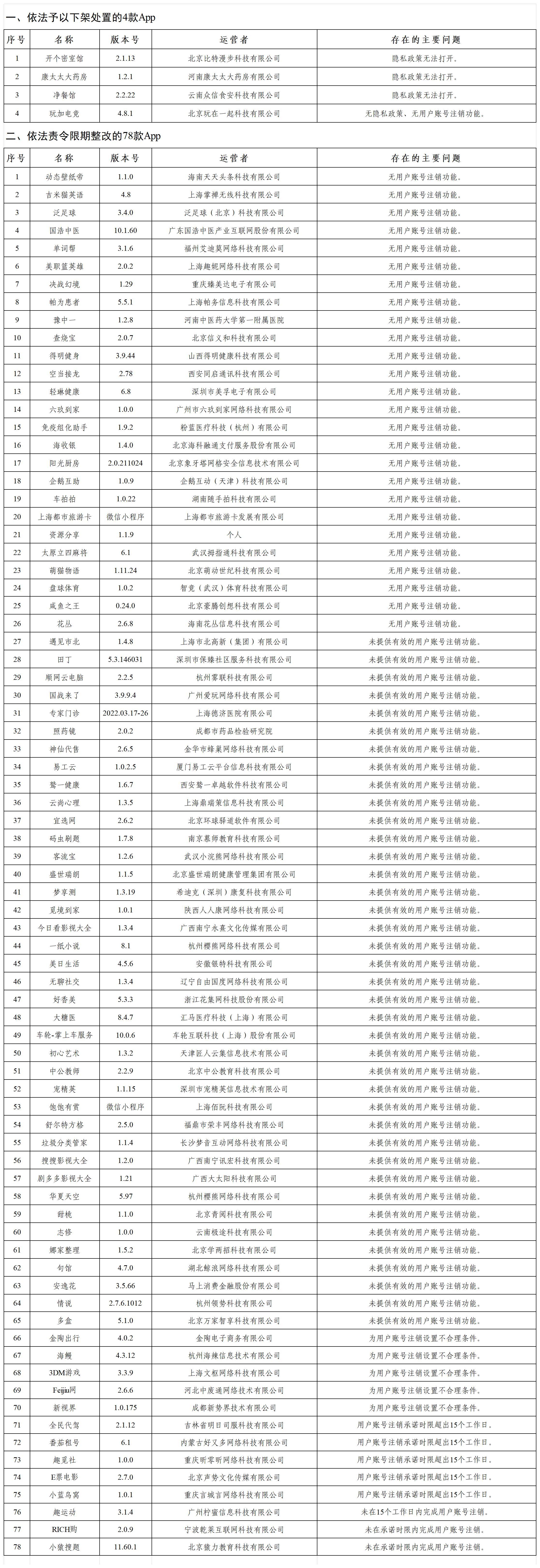 经查,“开个密室馆”等4款App存在未公开收集使用规则问题,违反《个人信息保护法》等法律法规,依法依规予以下架处置;“动态壁纸帝”等78款App存在未按法律规定提供删除或更正个人信息功能问题,违反《个人信息保护法》等法律法规,依法依规责令限期1个月完成整改,逾期未完成整改的,依法依规予以下架处置。