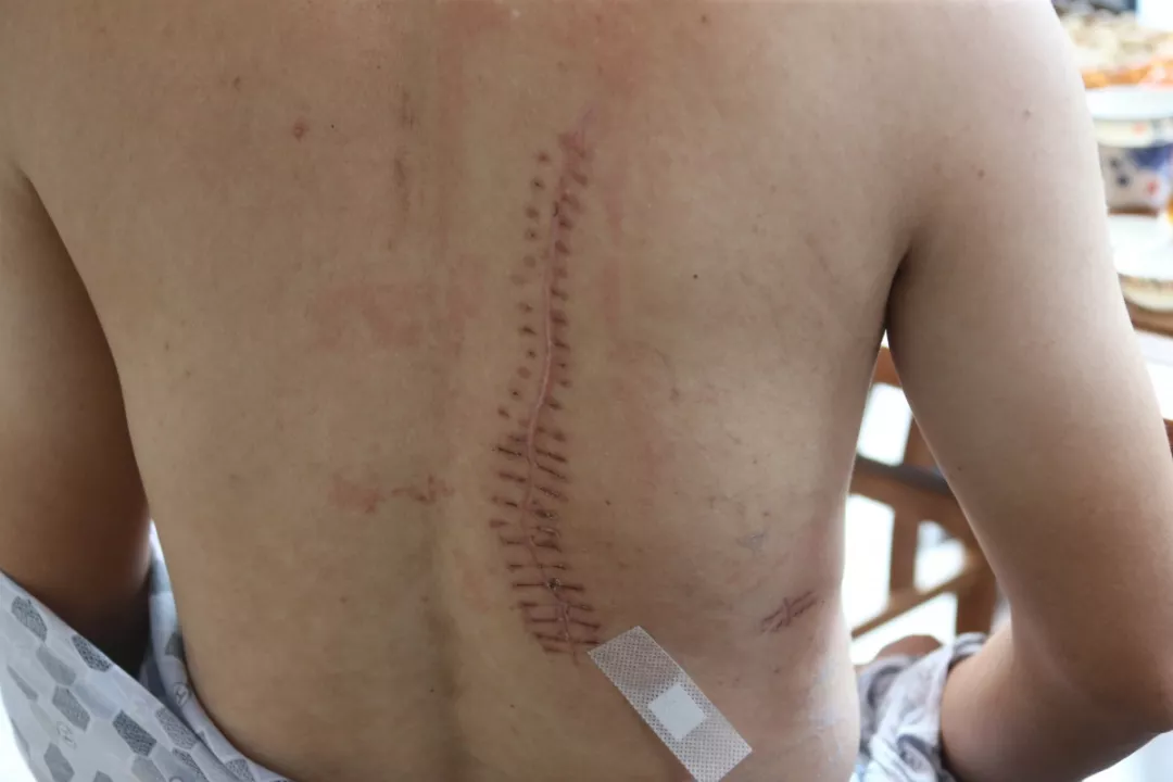 这时候的陈江桥身中四刀,其中脖颈、背部、腰部三刀最为严重,最长的伤口超过25公分,背部肌肉割裂18公分,可清晰见到内脏,所幸脖颈伤口离大动脉还有2公分,腰部只划破肾脏一点,据抢救的医务人员介绍,陈江桥失血1000多CC,进ICU时血压只有20,缝合39针,所幸经抢救无生命危险