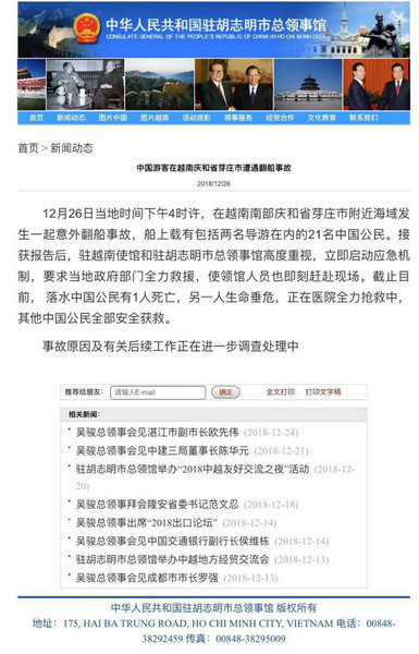 据中国驻胡志明市总领事馆消息,越南当地时间26日下午4时许,在越南南部庆和省芽庄市附近海域发生一起意外翻船事故,船上载有包括两名导游在内的21名中国公民。接获报告后,驻越南使馆和驻胡志明市总领事馆高度重视,立即启动应急机制,要求当地政府部门全力救援,使领馆人员也即刻赶赴现场。截止目前,落水中国公民有1人死亡,另一人生命垂危,正在医院全力抢救中,其他中国公民全部安全获救。
