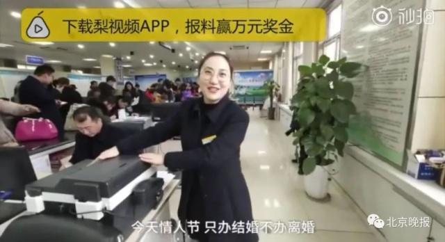 视频中,一位工作人员说“来了几对离婚的,然后叫他们走了,今天情人节,只办结婚不办离婚,因为情人节就是个喜庆的日子。”