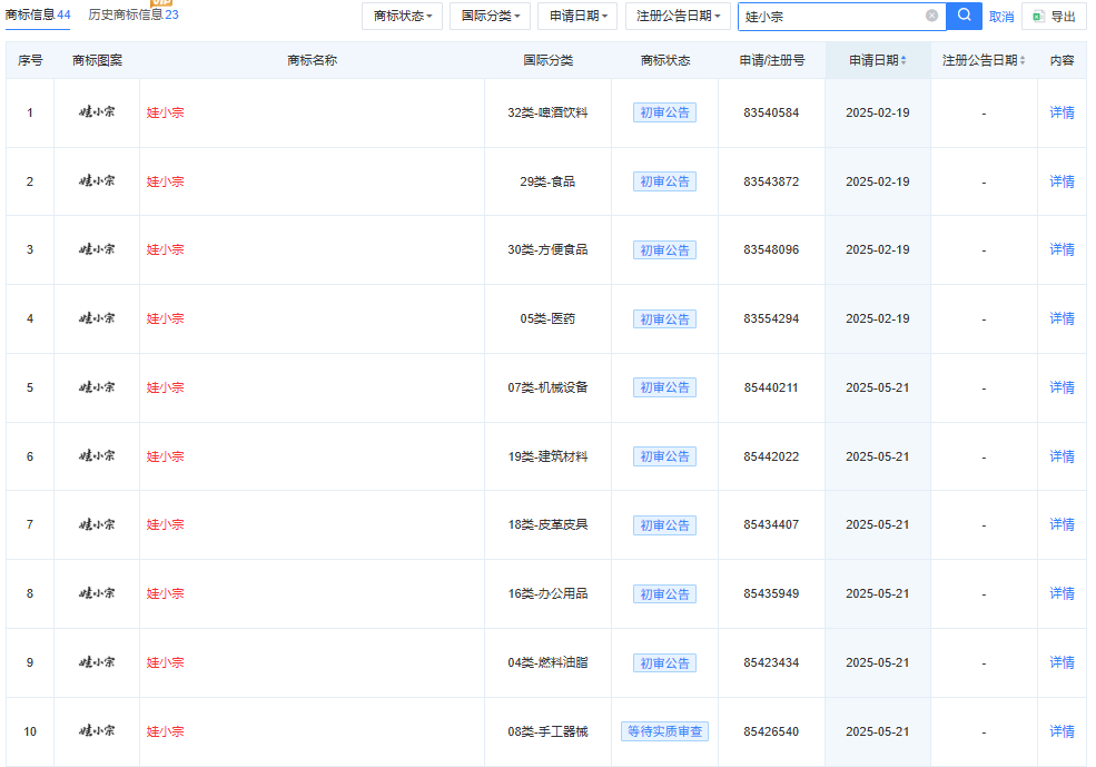 通过天眼查App记者注意到,今年以来,宏胜集团已申请数十个“娃小宗”相关商标,国际分类包括啤酒饮料、食品、方便食品和医药等,部分商标已通过初审,部分商标还在等待实质审查。