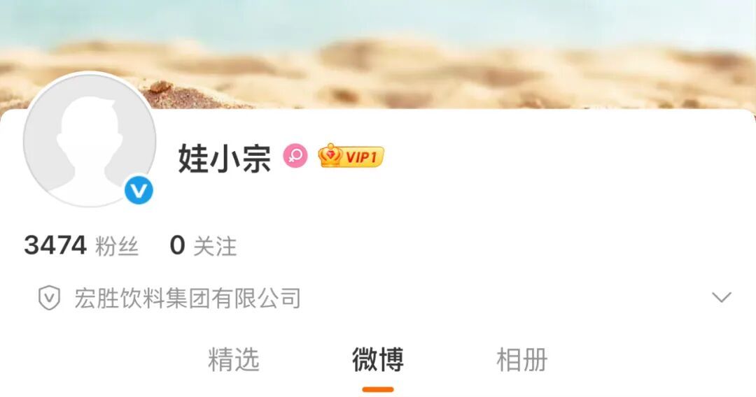 最新消息:“娃小宗”已注册微博账号,认证企业为宏胜饮料集团有限公司。截至11日中午发稿时,该账号粉丝数为3474人,暂未发表内容。