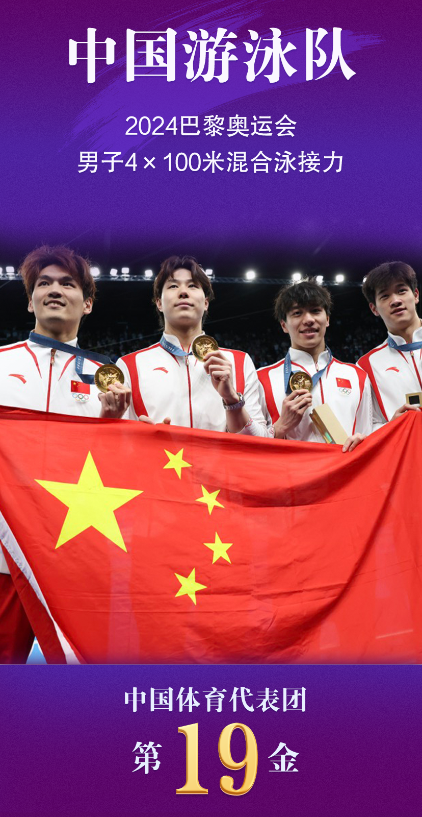 当地时间8月4日,巴黎奥运会游泳项目在拉德芳斯体育馆进行最后一个比赛日争夺。在刚刚结束的男子4×100米混合泳接力决赛中,由徐嘉余、覃海洋、孙佳俊、潘展乐组成的中国队夺得金牌。