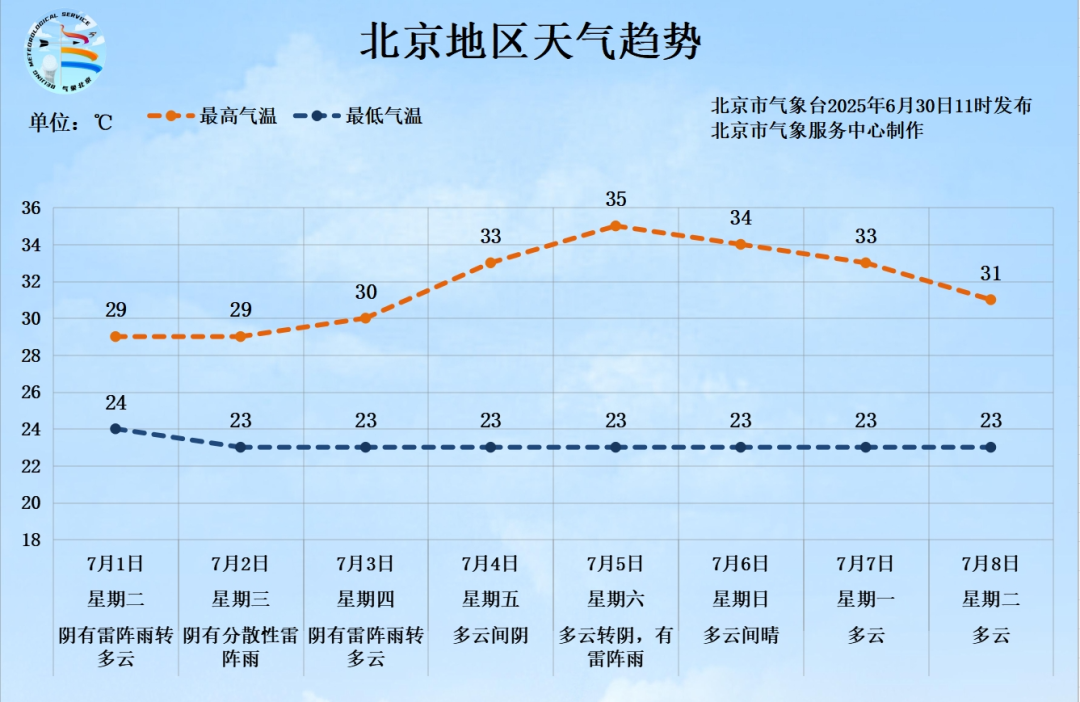 7月1日至7月8日白天最高气温29~35℃,夜间最低气温23~24℃。