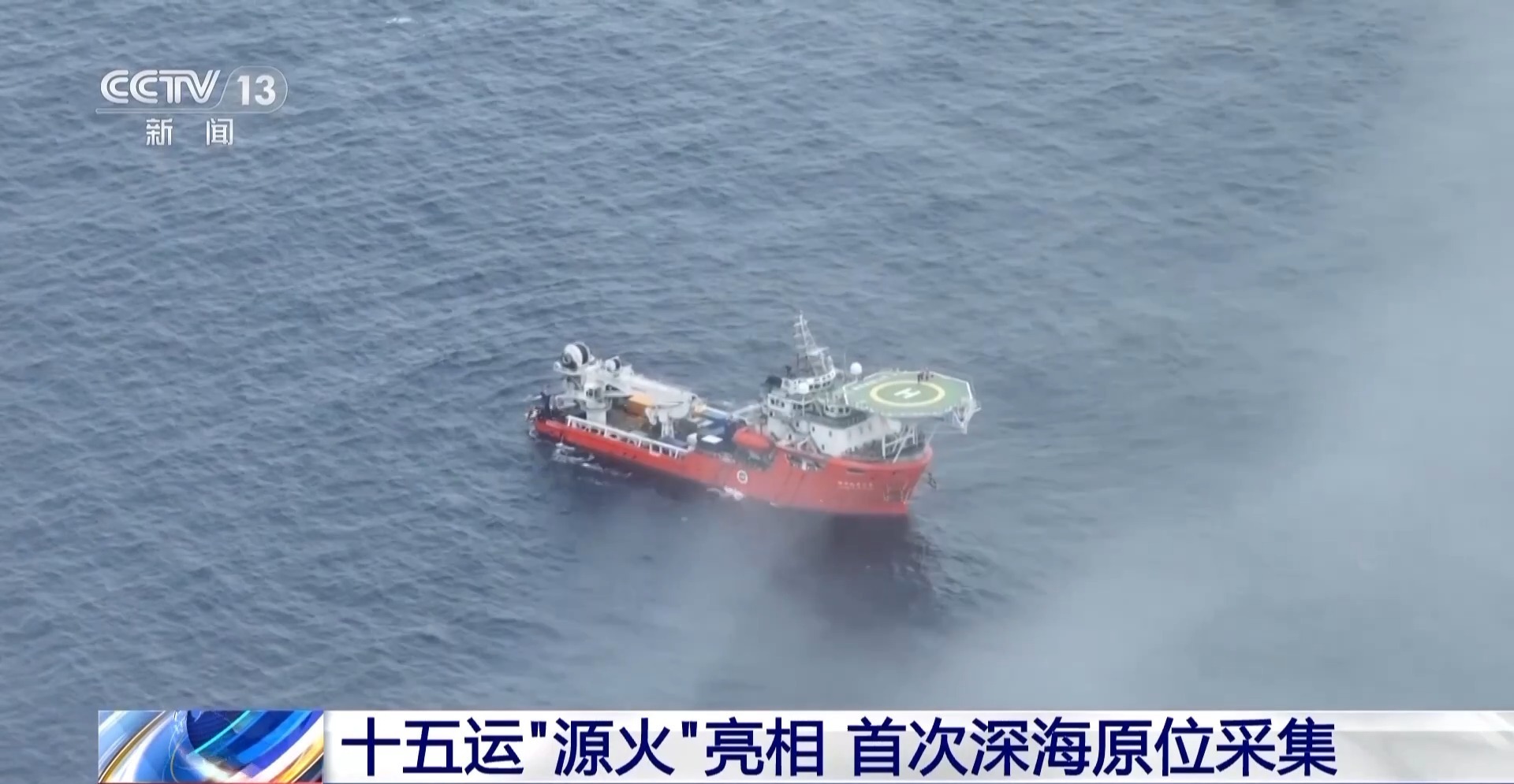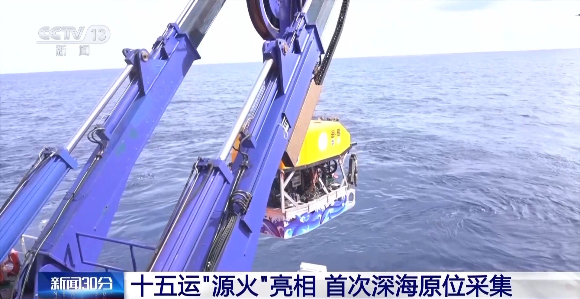 总台记者 何伟奇:十五运会和残特奥会的“源火”采集装置正在从船上往深海海底下潜。