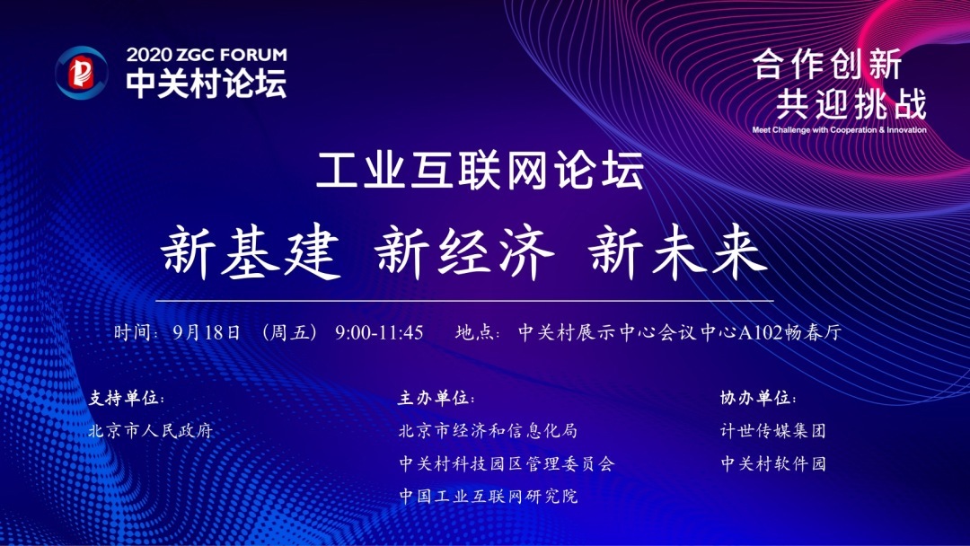北京市经济和信息化局、中关村科技园区管理委员会、中国工业互联网研究院(简称工联院)拟围绕“新基建、新经济、新未来”主题,于2020年9月18日(周五)上午9点,在中关村展示中心会议中心的畅春厅组织召开中关村论坛工业互联网论坛。