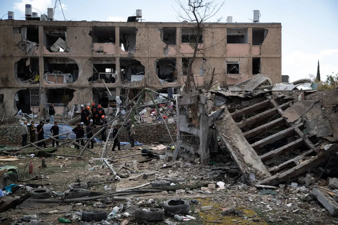 这是3月22日在以色列南部城市迪莫纳拍摄的在导弹袭击中受损的建筑。