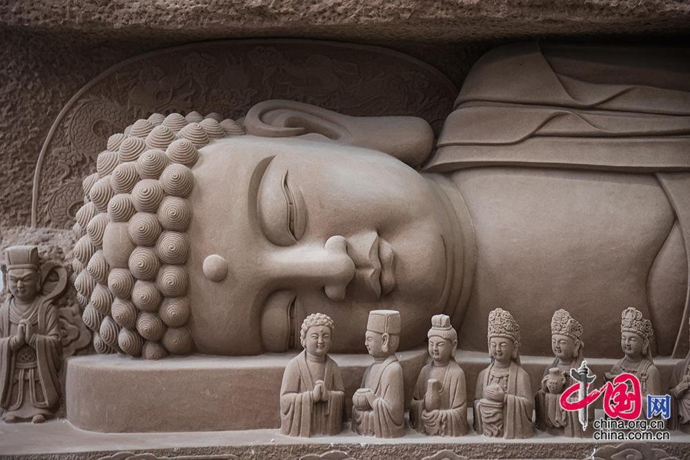 重庆市大足区因大足石刻而闻名世界,图为以重庆大足石刻卧佛摩崖造像为原型创作的石刻作品。中国网记者 伦晓璇 摄