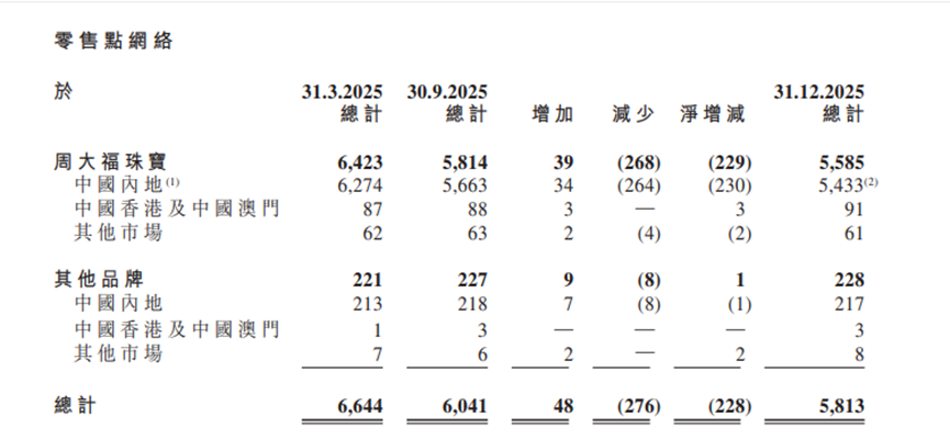 北京时间根据周大福此前发布的财报统计,2025年全年,周大福中国内地总共关闭零售点1342个,同时新增线下销售点109个,净减少1233个。