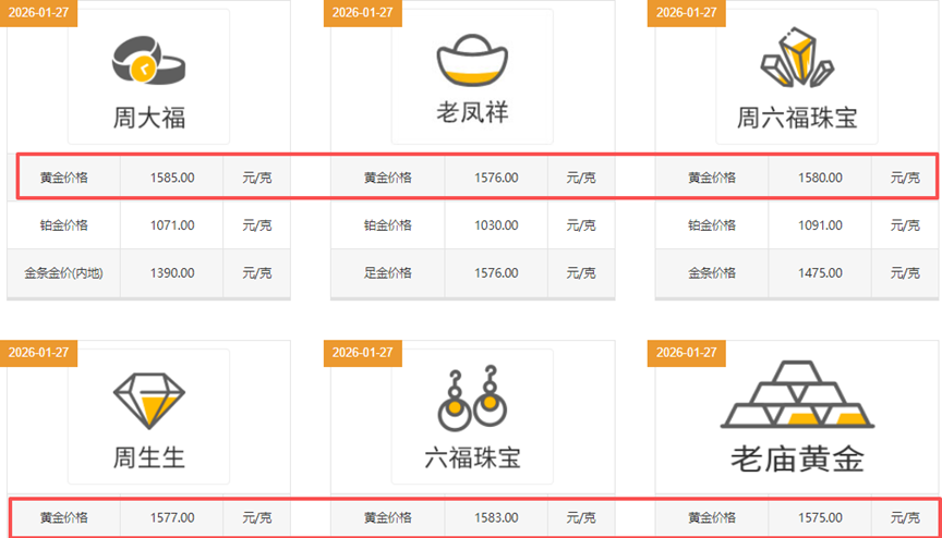 据金投网显示,1月27日的实物黄金价格为:周大福为1585元/克,老凤祥为1576元/克,周六福珠宝为1580元/克。
