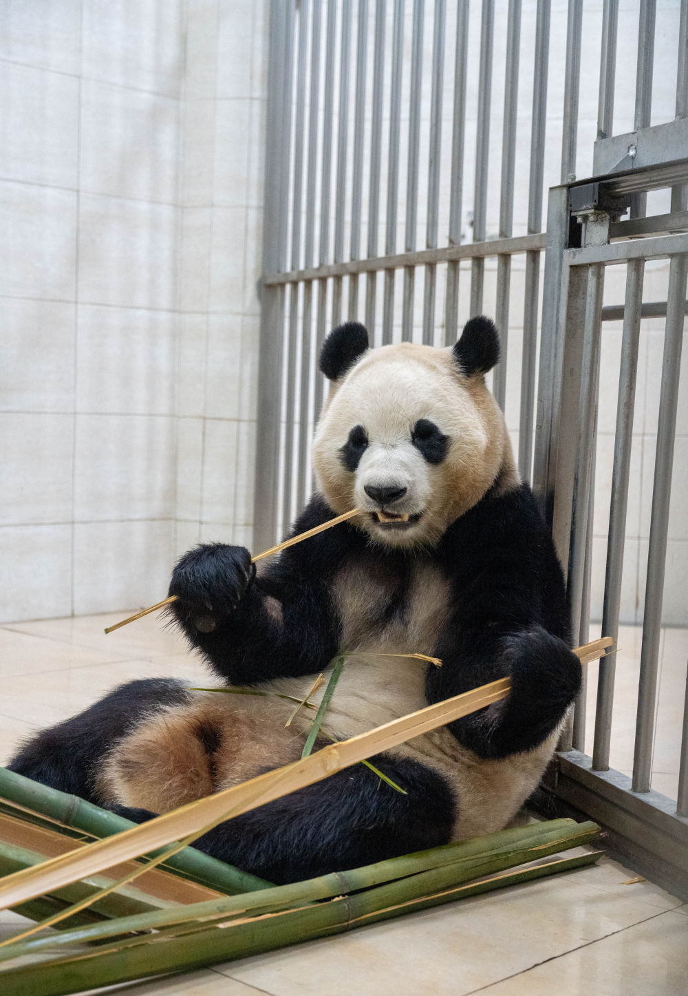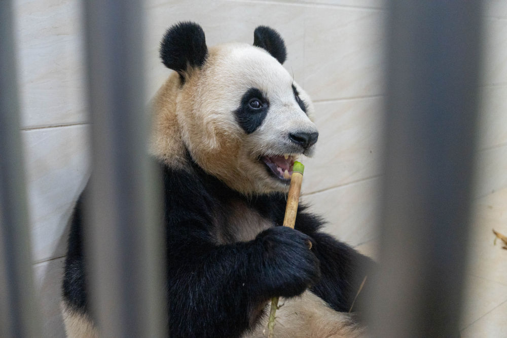 12月4日上午,大熊猫“福宝”在吃竹子,进食过程中未出现发抖行为。新华社记者 薛晨 摄