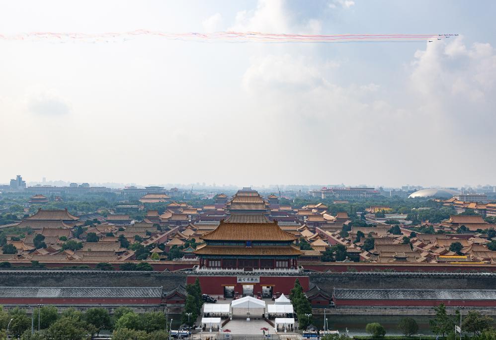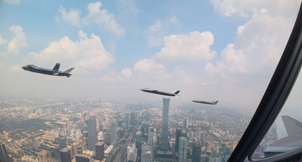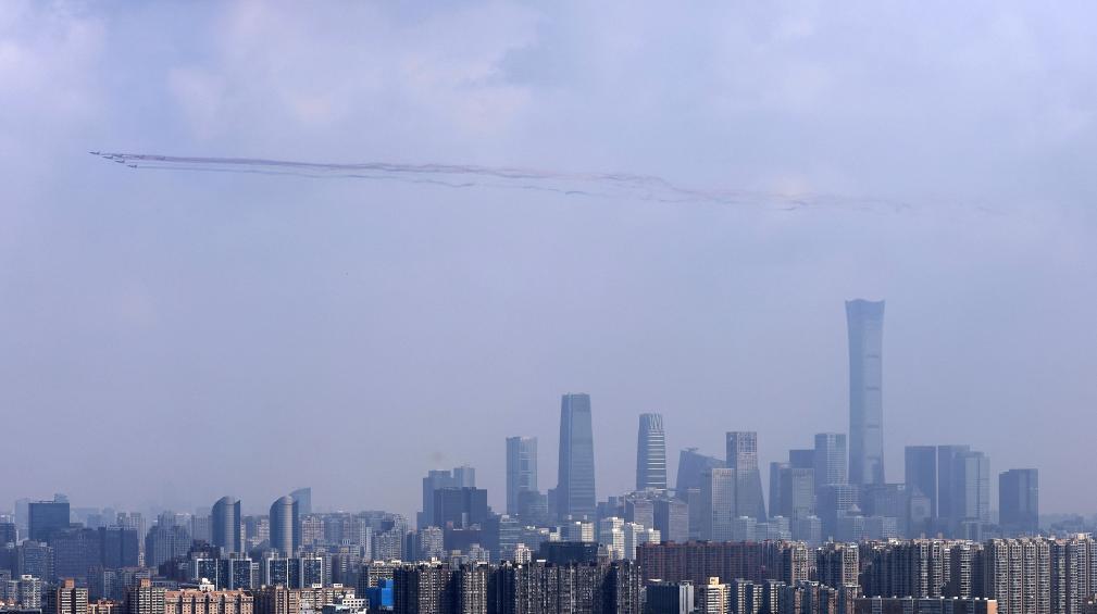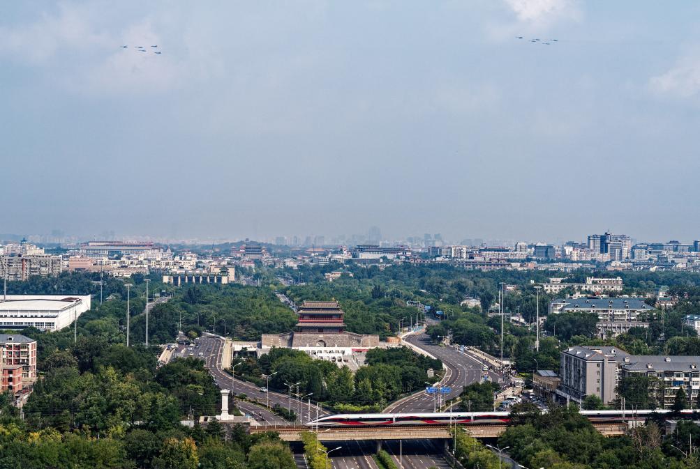 这是歼击机梯队从北京城区上空飞过。新华社记者 白雪骐 摄
