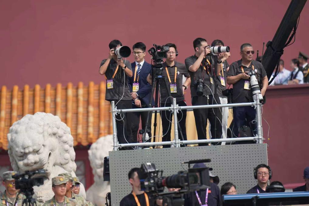 这次报道,很多点位的记者,拍下了引发全网共鸣的经典作品,比如敬礼老兵与受阅部队同框的照片,和平鸽与国徽同框的照片,天坛与战斗机同框的照片。这些都是记者通过他的镜头语言,来表达思想,来传递价值。这些照片的经典性和思想性,正是新华社国家摄影队的气质。