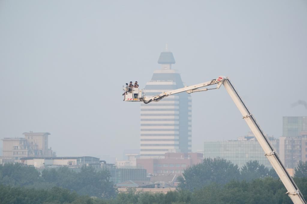 新华社记者张铖、刘续在消防云梯车上拍摄。新华社记者 赖向东 摄