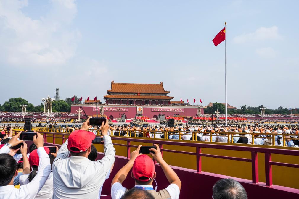 这是群众拍摄战旗方队通过天安门广场。新华社记者 李博 摄
