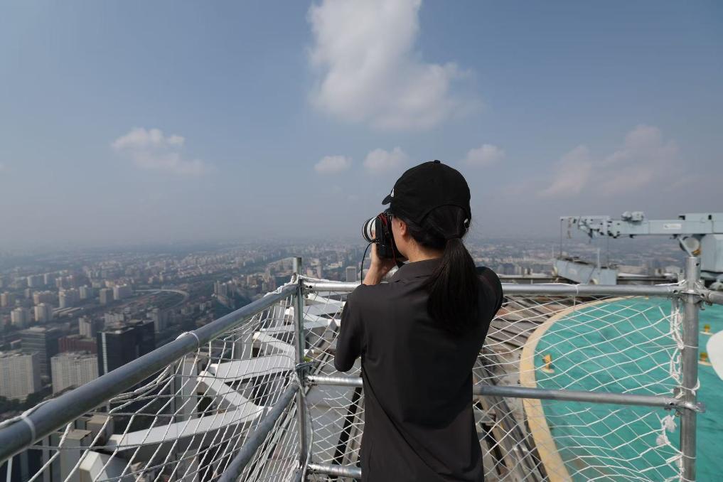 新华社记者那宇奇在国贸三期82层云顶平台南侧拍摄。新华社记者 胡星宇 摄