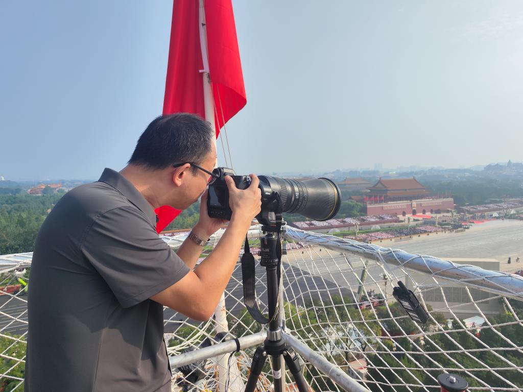新华社记者饶爱民在金水桥西桥窝高台拍摄。