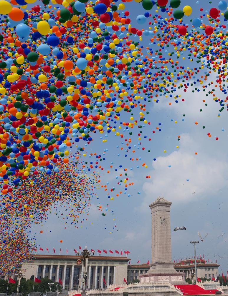 这是天安门广场放飞气球和鸽子。新华社记者 江文耀 摄