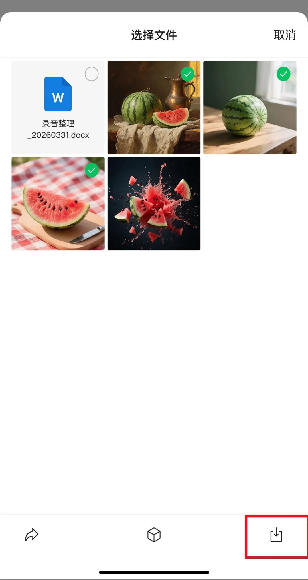 除了直接转发压缩包,也可以选择单个或多个压缩包里的文件一键保存、转发、收藏。
