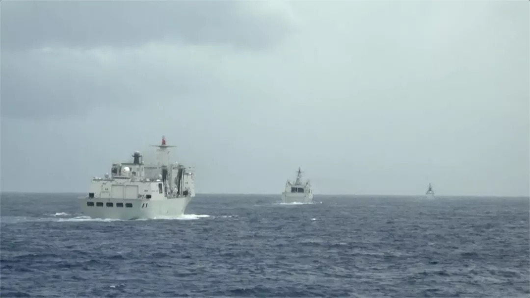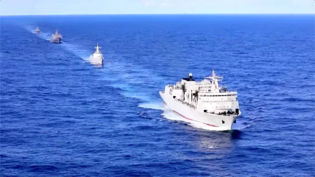 银川舰、五指山舰和天枢星船与综合补给舰查干湖舰组成“两横一纵”补给队形。